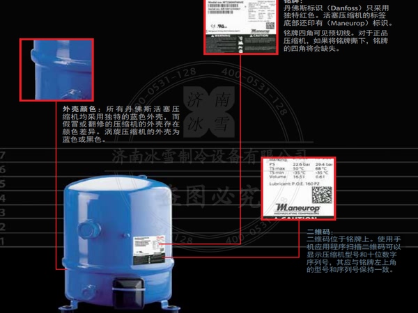 1、外殼顏色:所有丹佛斯活塞壓縮機均采用獨特的藍色外殼,而假冒或翻修的壓縮機的外殼存在顏色差異。渦旋壓縮機的外殼為藍色或黑色。